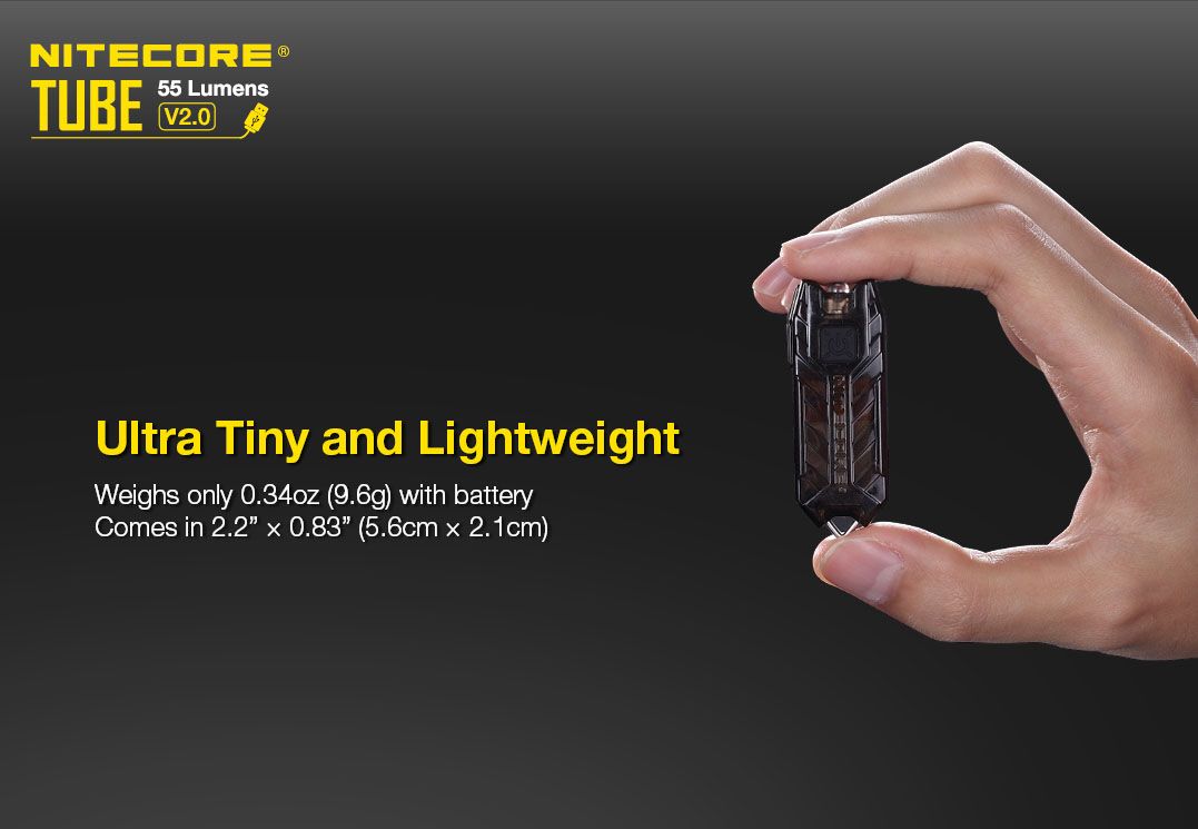 The Nitecore TUBE 2.0 is a miniature, ultralight, yet powerful USB-rechargeable keychain flashlight with an output of up to 55 lumens. Its body is crafted from highly durable polycarbonate and features a stainless steel keyring, allowing you to attach it anywhere and keep it within easy reach at all times.