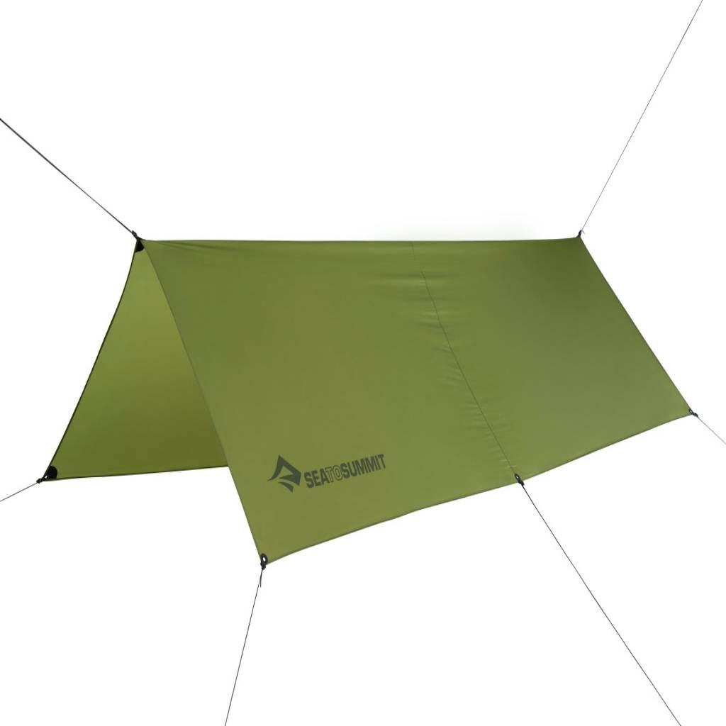 The Sea To Summit Jungle Hammock Tarp is an ultralight and spacious tarp designed to be pitched over a hammock, but it also works perfectly for traditional sleeping on the ground. The tarp comes with pre-attached guy lines featuring a Lineloc tensioning system and 8 reinforced loops with openings for trekking pole setup.