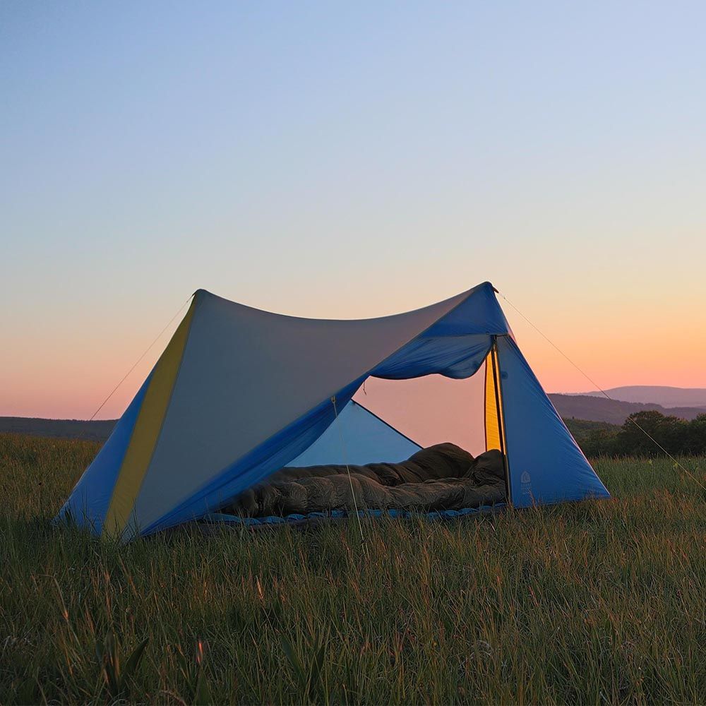 Ultralight tarptent for 2 people, set up on 2 trekking poles. Thanks to its asymmetrical shape, you've got plenty of headroom inside. The Sierra Designs High Route Tarp 2 has two doors and weighs 661 grams.