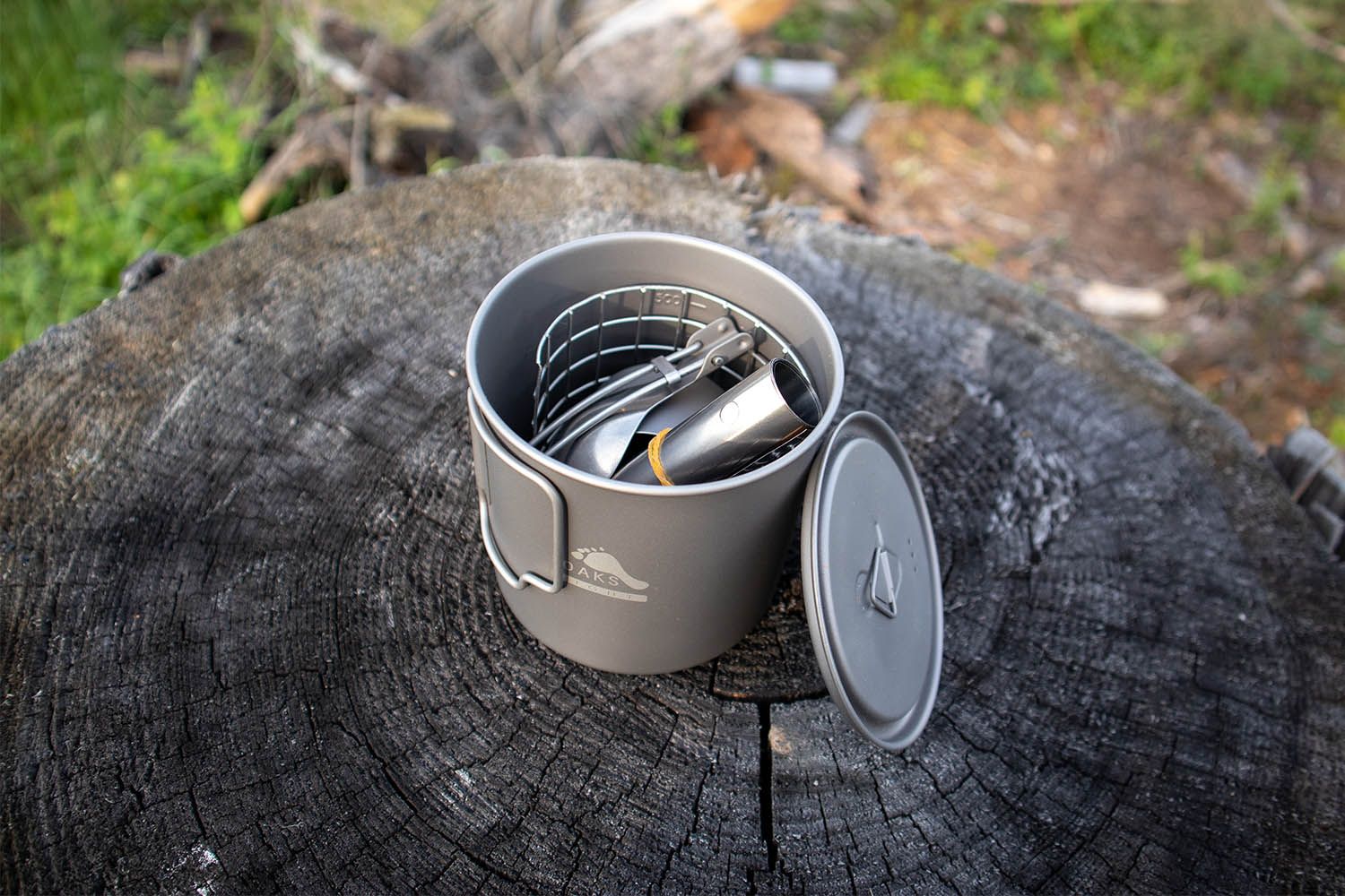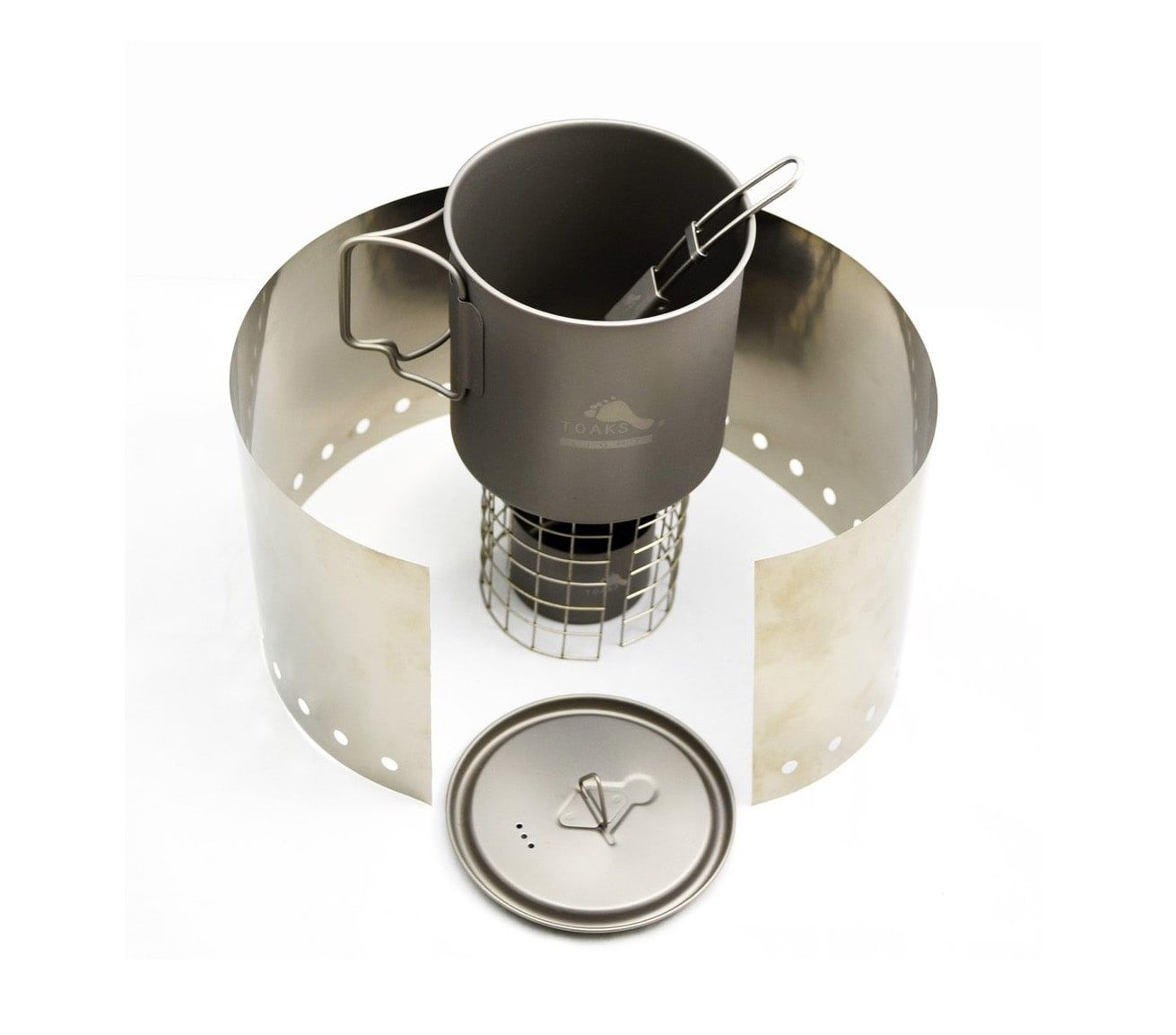 The 650 ml pot features measurement markings on the inside. The TOAKS alcohol stove has a double-wall design that preheats and vaporizes the fuel. The flame is emitted both from the center and from small openings around the edge. For the alcohol stove, we recommend using only high-quality alcohol (bioethanol) with an ethanol content of 90% or more, which burns with a natural flame, free of odor and soot.