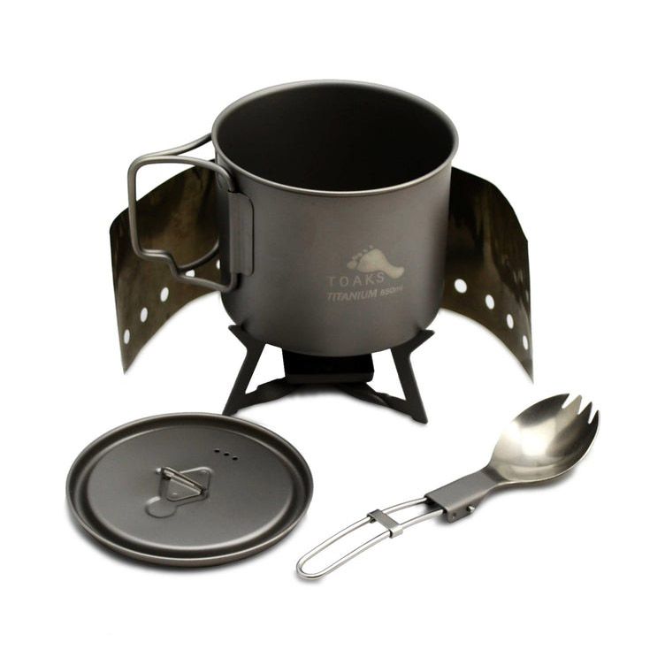 Ultralight titanium set with a solid fuel stove contains everything you need to prepare food and get it into your stomach. The total weight of the set is an incredible 113 g. This set is ideal for heating water for dehydrated meals, coffee or tea.