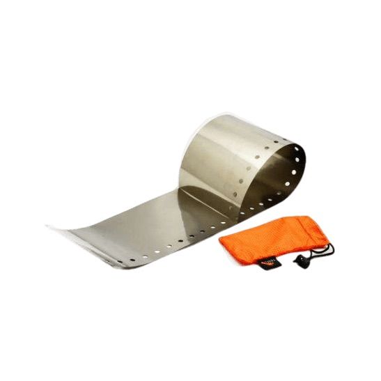 The windscreen features openings at the bottom to ensure sufficient oxygen flow to the stove. The height of the windscreen is 11 cm and the total length is 58 cm. The windscreen is ultralight (14 grams) and highly packable, easily rolling into a thin cylinder. When unrolled, the windscreen may tend to curl back slightly. If this happens, you can secure the ends together using a simple paper clip during use.