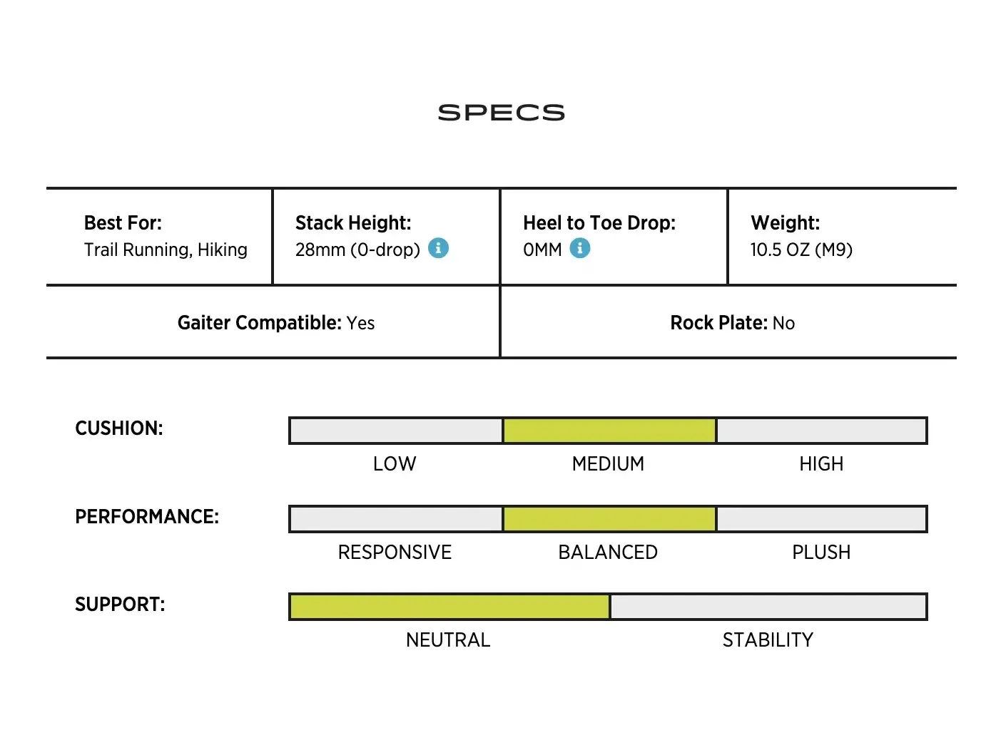 The Pursuit 2 is a comfortably cushioned shoe with a 28 mm thick ZipFoam™ midsole and a zero-drop design. It is built on a Vibram® Megagrip outsole, which provides great traction even on wet rocky surfaces. Additionally, it features a special FKT insole designed for quick water drainage in wet conditions.