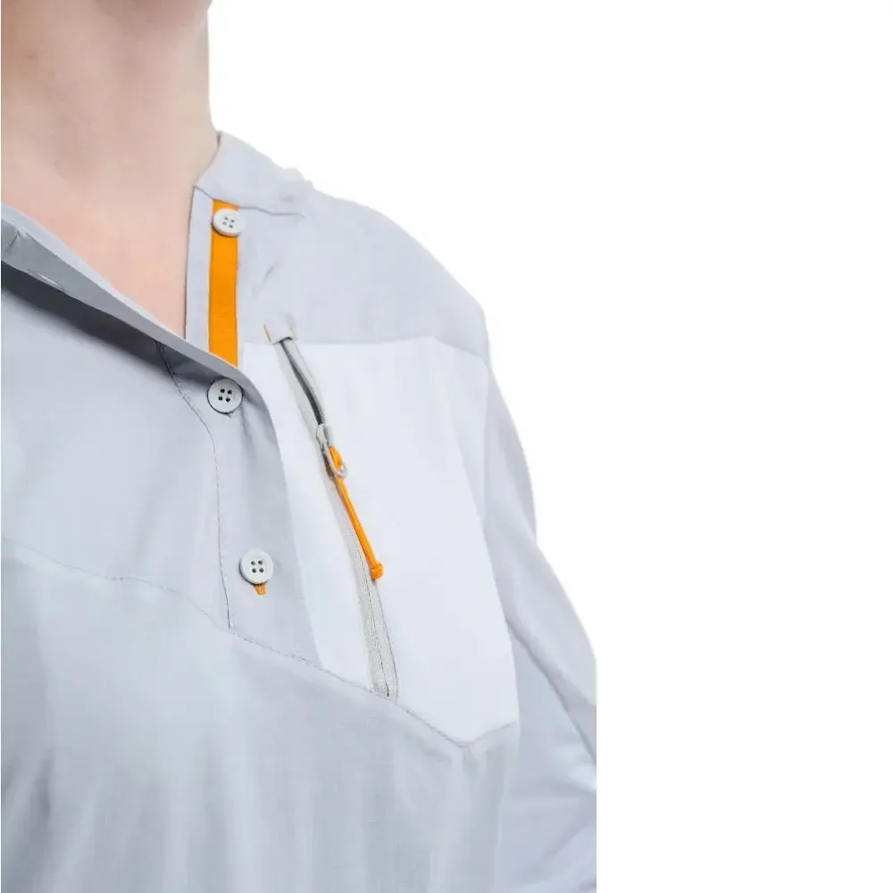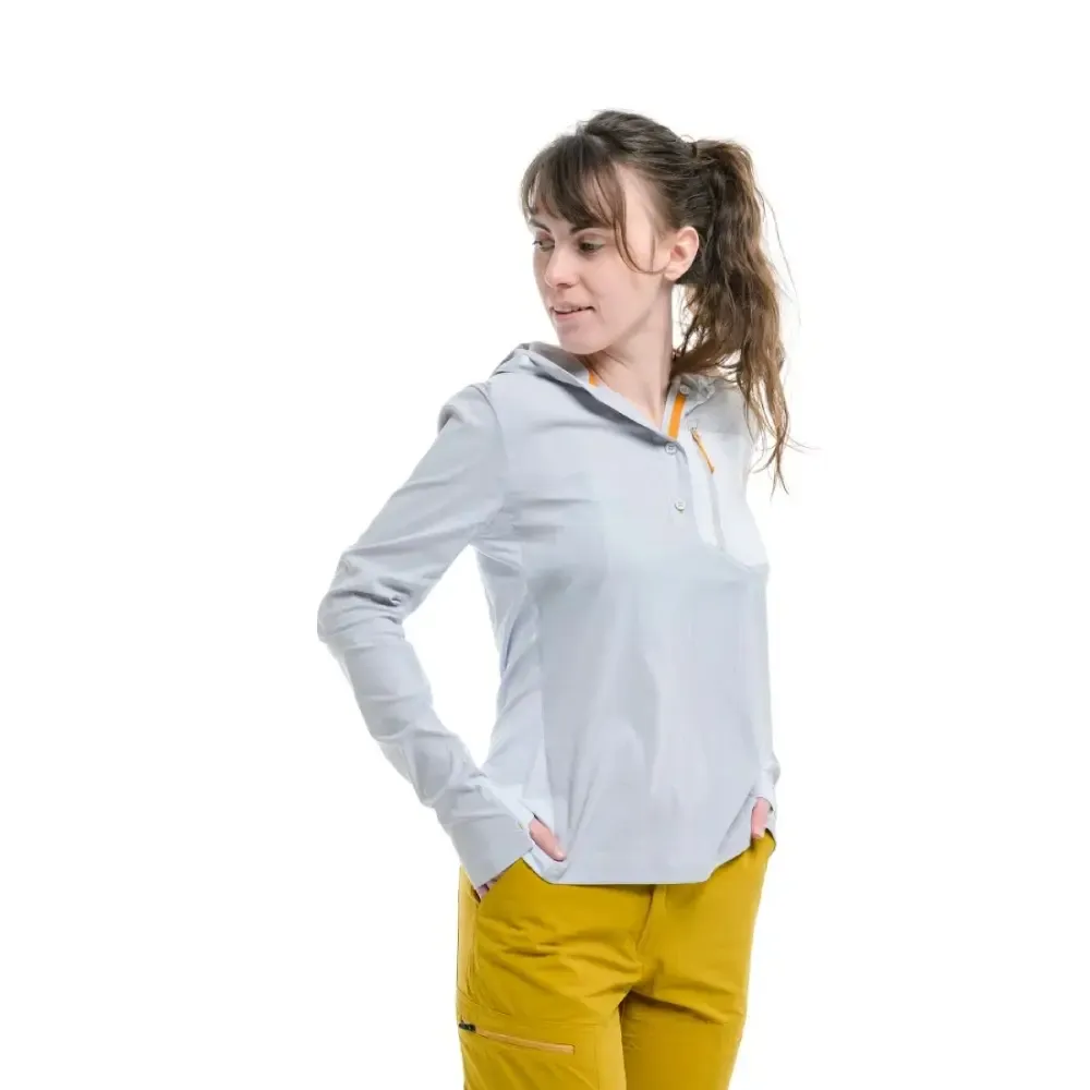 Turbat Maya Hood Trek Wmn is a women's base layer that combines the lightness of a trekking shirt with the functionality of a thin long-sleeve tee with a hood (so-called sun hoodie). Thanks to the hood, stretchy quick-drying material, and certified UV protection UPF50+, it's perfect for summer long-distance treks and backpacking trips. It wicks away sweat really well and doesn’t restrict your movement even on the toughest expeditions.