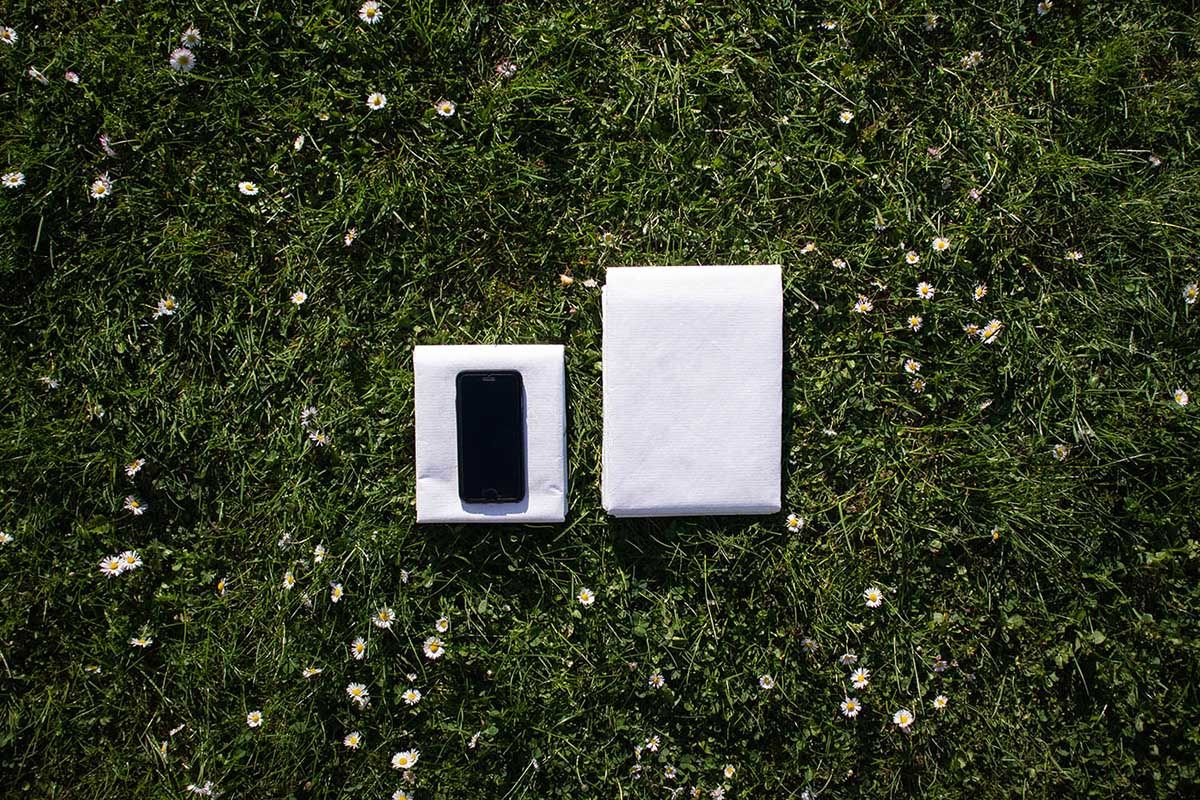 In the photo, you can see a comparison of the packed large and small Tyvek sheets alongside the size of a cell phone.